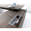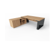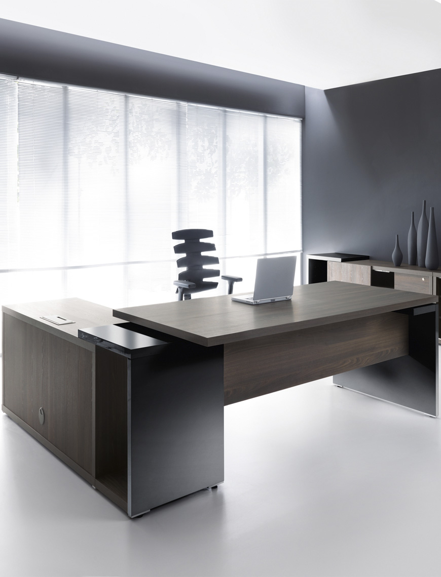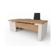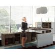 Het elektrisch verstelbare directiebureau is leverbaar in 2 verschillende houtdecors in combinatie met hoogglans witte of hoogglans zwarte elementen.